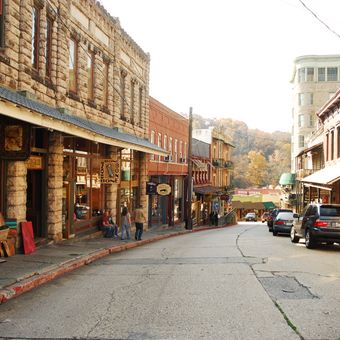 Las calles del Distrito Histórico de Eureka Springs siguen el terreno montañoso natural, con edificios construidos en varios niveles conectados por escaleras.