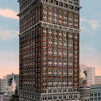 El edificio Farmers Bank, con sus 27 pisos, presenta fachadas de piedra y elementos arquitectónicos que representan técnicas de construcción comercial.