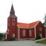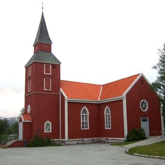 La Iglesia Elverhøy exhibe paredes de madera roja, revestimiento de paneles verticales y un gran campanario ubicado sobre su entrada principal.