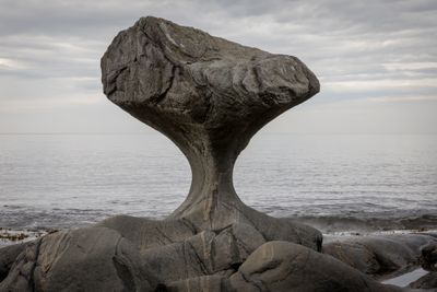 El Kannesteinen, de tres metros de altura, muestra una forma de hongo creada por la erosión de las olas del Océano Atlántico y el hielo.
