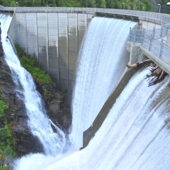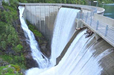 La presa Zakariasdammen se extiende por la garganta Nedstedalsjuvet, alcanzando 96 metros de altura y conteniendo 70 millones de metros cúbicos de agua.