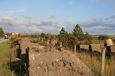 Grandes bloques de piedra forman hileras a lo largo de la costa noruega en Brusand, creando una barrera defensiva contra posibles desembarcos militares.