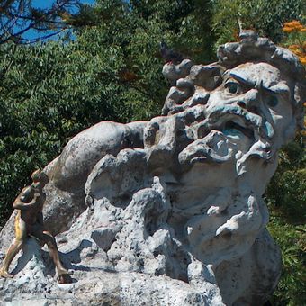 Una escultura de piedra de Adamastor, el gigante mitológico del poema épico Los Lusíadas, se alza en la terraza conmemorando la exploración marítima portuguesa.