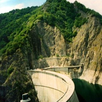 La presa Vidraru es una estructura de arco de hormigón que atraviesa el río Argeș entre las montañas Frunții y Ghițu. Contiene agua para crear un gran embalse en el valle montañoso.