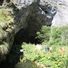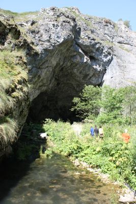 Un lago azul se forma en la entrada de la cueva, creado por un río subterráneo rico en caliza que emerge de las profundidades.