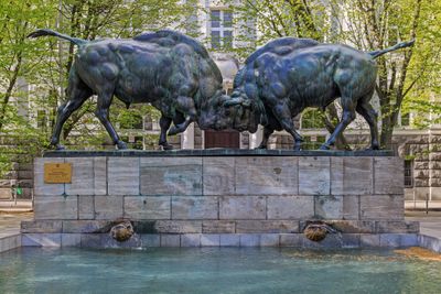 Dos grandes figuras de bisonte en bronce se alzan en posición de combate, mostrando sus formas musculares y confrontación en la entrada del tribunal.