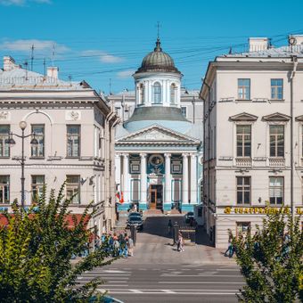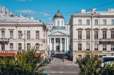 La iglesia se encuentra cerca de la estación de metro Nevsky Prospekt y requiere vestimenta respetuosa para ingresar al área principal de culto.