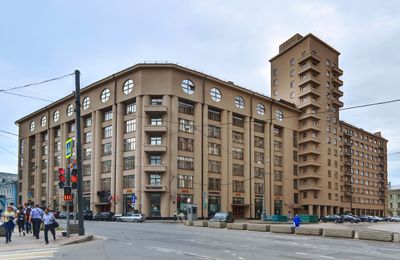 Los arquitectos Ivan Fomin y Arkady Langman diseñaron el edificio entre las guerras mundiales, cuando la Unión Soviética quería modernizar rápidamente su capital. Surgió durante una época en que el paisaje urbano de Moscú estaba cambiando drásticamente y nuevos tipos de edificios estaban reemplazando la arquitectura más antigua de la ciudad.