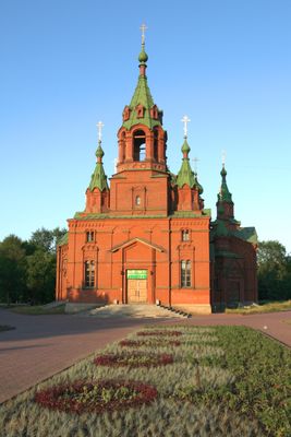 La iglesia de ladrillo rojo presenta una arquitectura tradicional del Renacimiento ruso con una estructura de cúpula cruciforme en un parque público.