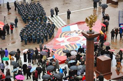 Esta columna de granito y bronce se alza frente al Centro Cultural Municipal y lleva el emblema nacional ruso en su cúspide. Cuatro pilares circundantes forman un complejo conmemorativo conectado que define la imagen general.