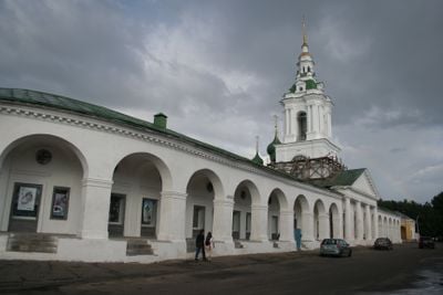 El Gostiny Dvor de Kostroma abarca más de diez edificios neoclásicos con hileras simétricas de celdas arqueadas a lo largo de la Plaza Susaninskaya.